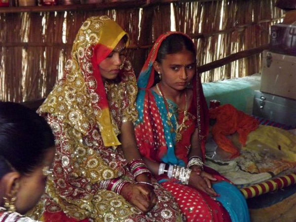 | Hemi, bé gái lở làng Vadia (Ấn Độ) ngồi trong túp lều của gia đình trước khi kết hôn. Chị gái Hemi ngồi bên cạnh. Theo các nhà tổ chức lễ cưới tập thể, chị gái Hemi là gái bán hoa. Ở nhiều vùng nông thôn Ấn Độ, các bé gái bị ép trở thành gái mại dâm để hỗ trợ gia đình nếu không sớm lấy chồng. Tổ chức phi chính phủ NGO đã tổ chức lễ cưới tập thể để cứu các bé gái thoát khỏi nạn mại dâm. Ảnh: Slate.