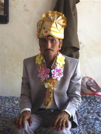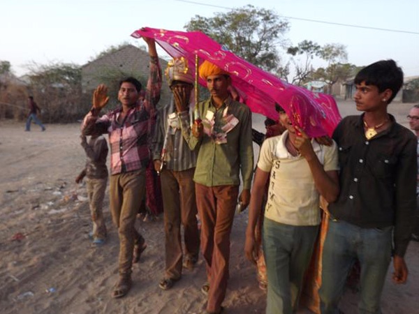| Một chú rể (giữa) đi cùng bạn bè trước lễ cưới tập thể. Cuộc sống ở nhiều vùng nông thôn Ấn Độ còn rất khó khăn, nhiều gia đình muốn con gái kết hôn sớm để đỡ miệng ăn. Ảnh: Slate.