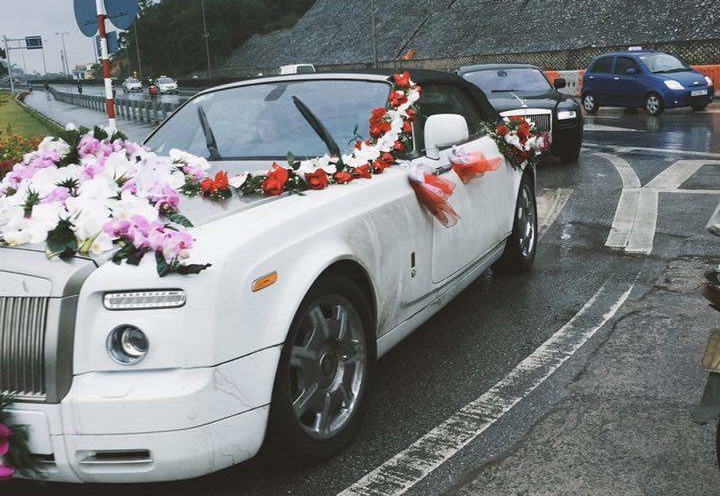 | Chú rể sinh sống ở Quảng Ninh, trong khi cô dâu là người Hà Nội. Xe hoa là chiếc Rolls-Royce Phantom Drophead Coupe màu trắng, mui đen. Giá bán chính hãng cho một chiếc mui trần 2 cửa Phantom ở Việt Nam là từ 30,2 tỷ đồng. |