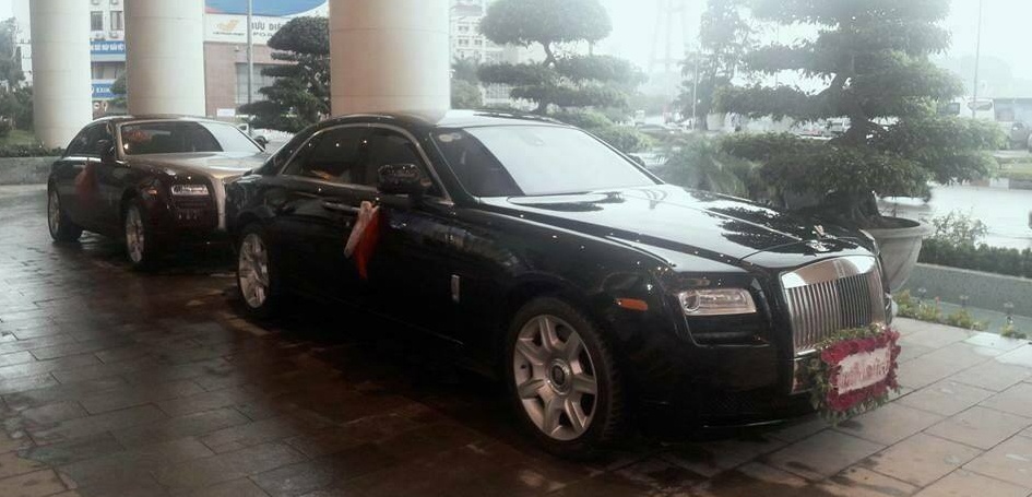 | Rước dâu về Quảng Ninh, dàn xe siêu sang quy tụ tại một khách sạn ở Bãi Cháy. Cặp Rolls-Royce Ghost theo sau xe hoa. Một chiếc Ghost ở Việt Nam có giá bán từ 17 tỷ đồng. |