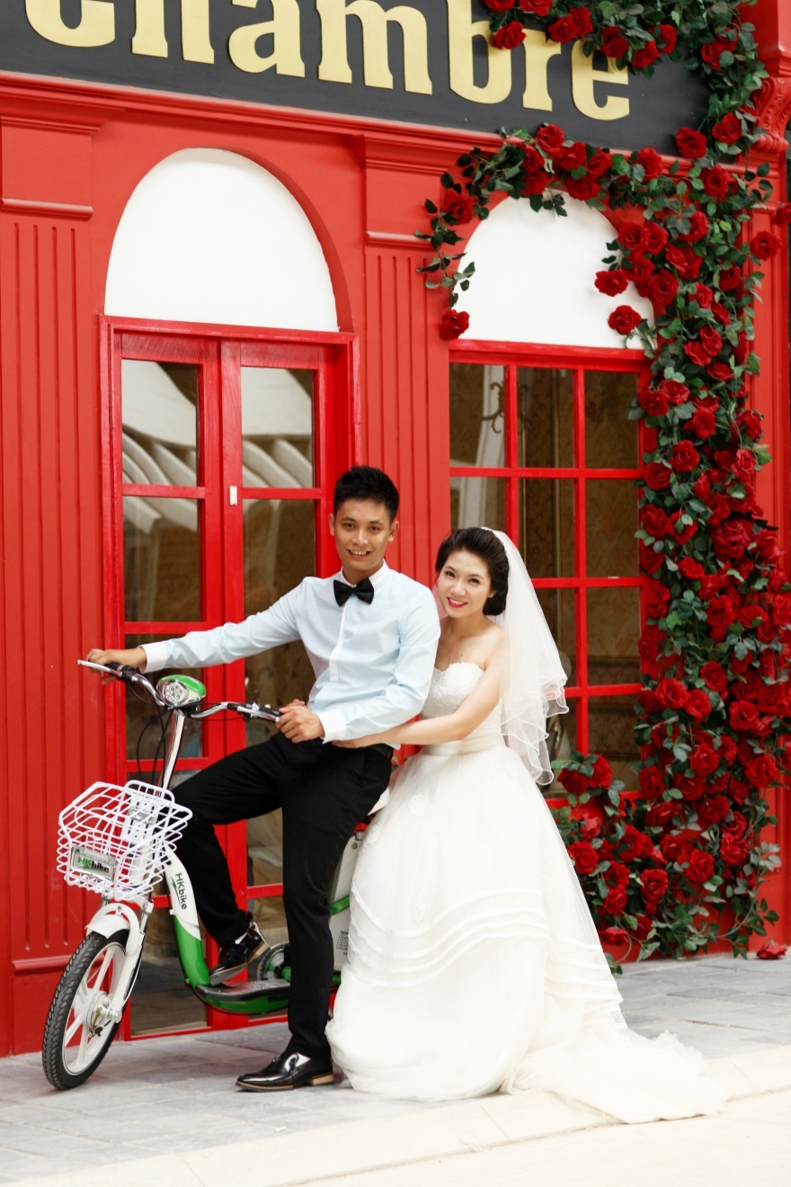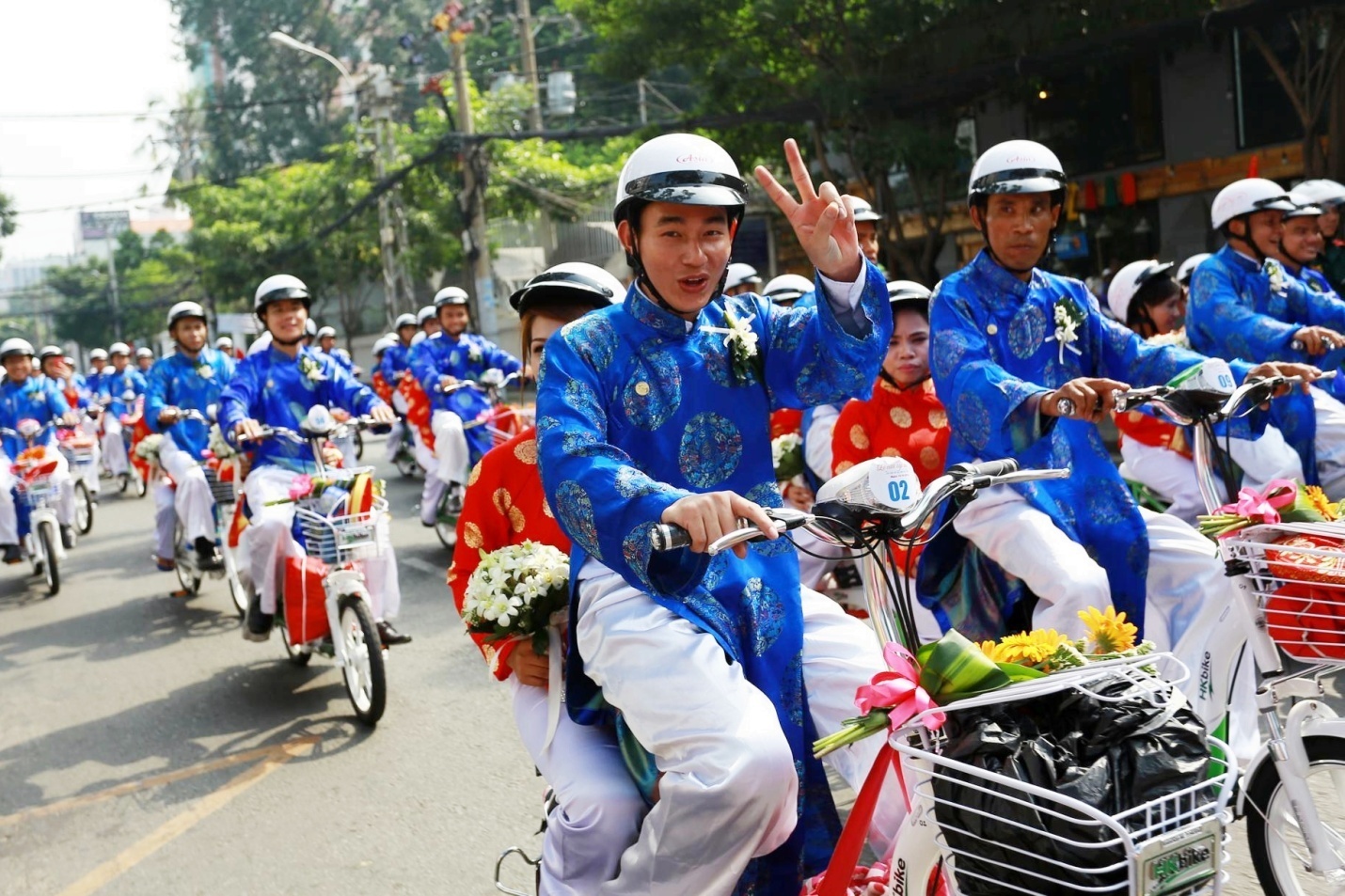 | Cô dâu, chú rể diện áo dài, khăn xếp theo nghi lễ truyền thống và tham gia diễu hành bằng xe đạp điện trên nhiều tuyến đường trung tâm thành phố. |
