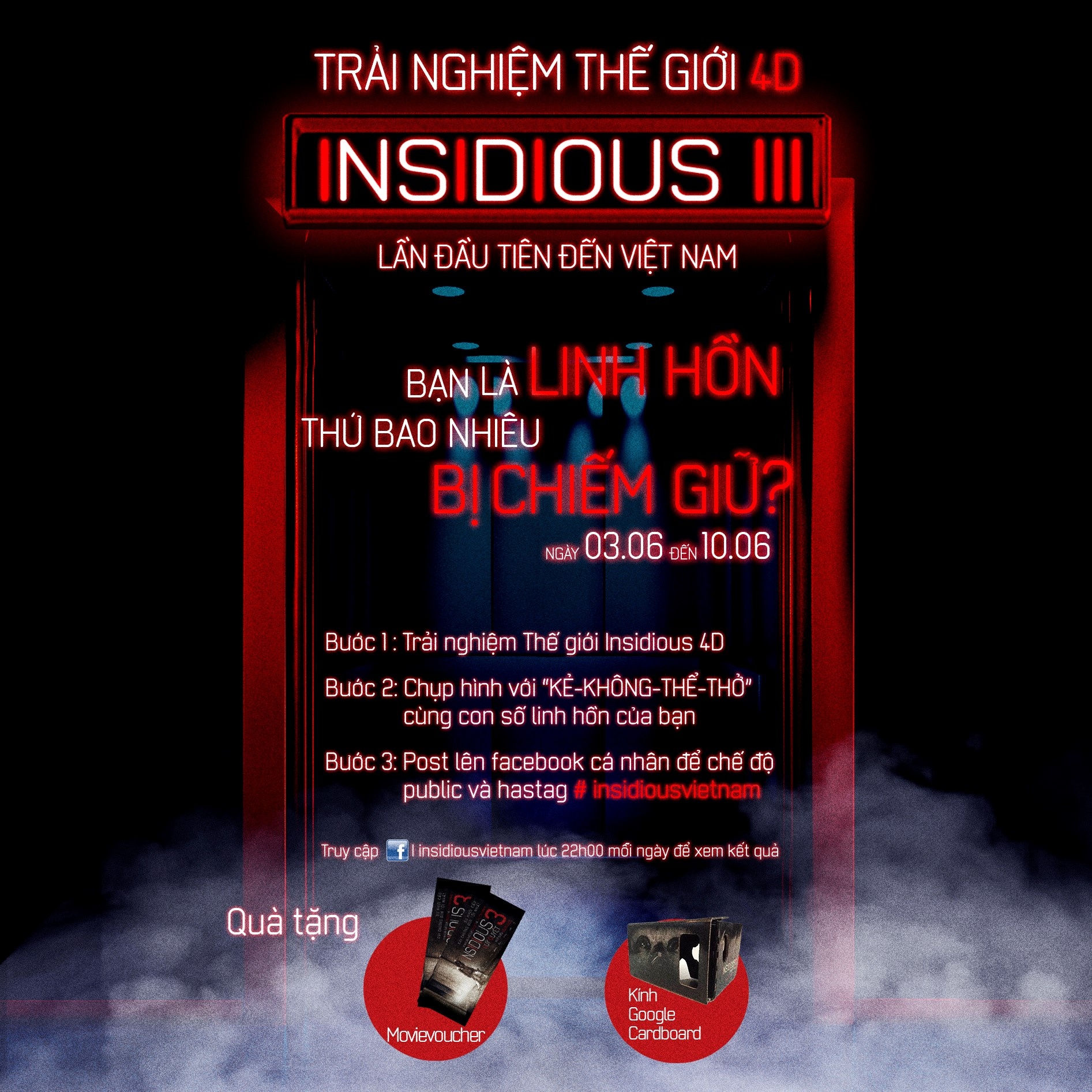 Tại Việt Nam, trước khi Insidious: Chapter 3 khởi chiếu, khán giả tại Hà Nội và TP HCM có cơ hội trải nghiệm thế giới 4D của The Further (Cõi Vô định) với kính Google Cardboard tại các rạp từ 18-21h các ngày từ 2-10/6.