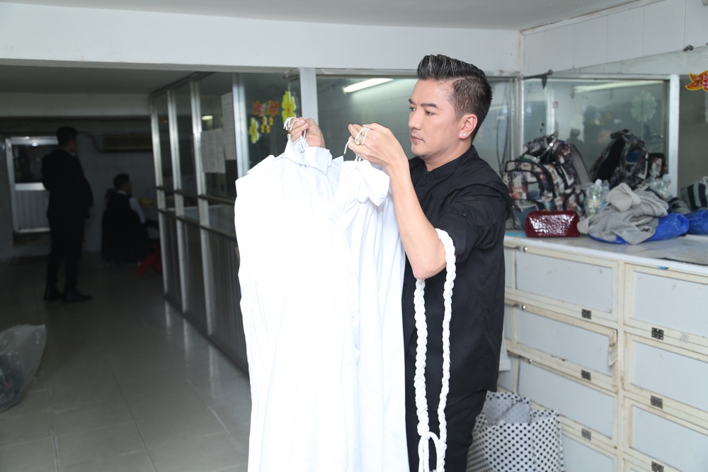 | Sau khi đã chuẩn bị xong trang phục của mình, Mr Đàm không quên giúp đỡ đàn em chăm lo vẻ ngoài. Anh bảo, là ca sĩ thì ngoài giọng hát, cần xuất hiện trước khán giả đẹp và hoàn hảo nhất. |