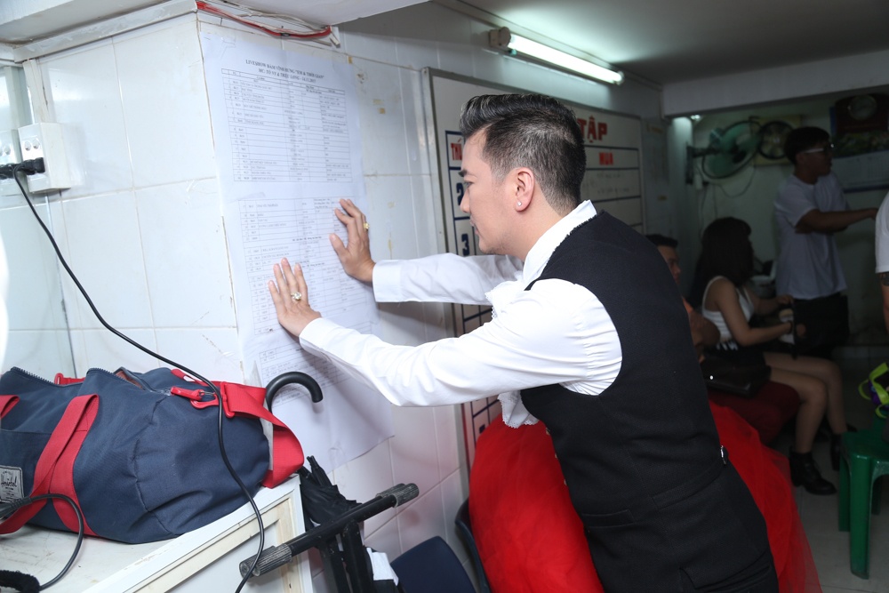 | Dù có ê kíp chuyên nghiệp giúp đỡ nhưng Đàm Vĩnh Hưng vẫn muốn quán xuyến mọi việc. Anh cẩn thận xem lại trình tự các tiết mục biểu diễn. |
