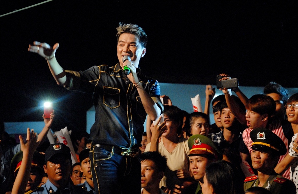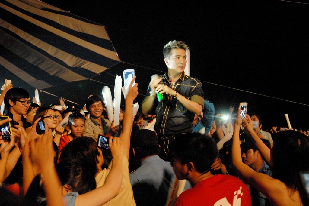 | Ngay khi xuất hiện, Đàm Vĩnh Hưng nhận được sự đón nhận nồng nhiệt của hơn 25.000 khán giả có mặt chật cứng sân vận động. |