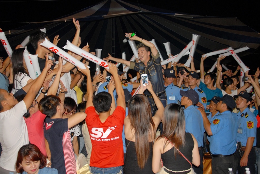 | Thay vì 3 ca khúc như dự kiến, Đàm Vĩnh Hưng nhảy lên ghế hát tới 7 bài cùng với hàng chục nghìn sinh viên và chỉ tiếc nuối tạm dừng khi đã quá khuya. |