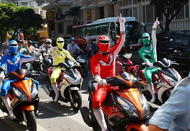 | Biệt đôi bê tráp diện đồ siêu nhân gây chú ý trên đường phố Sài Gòn. |
