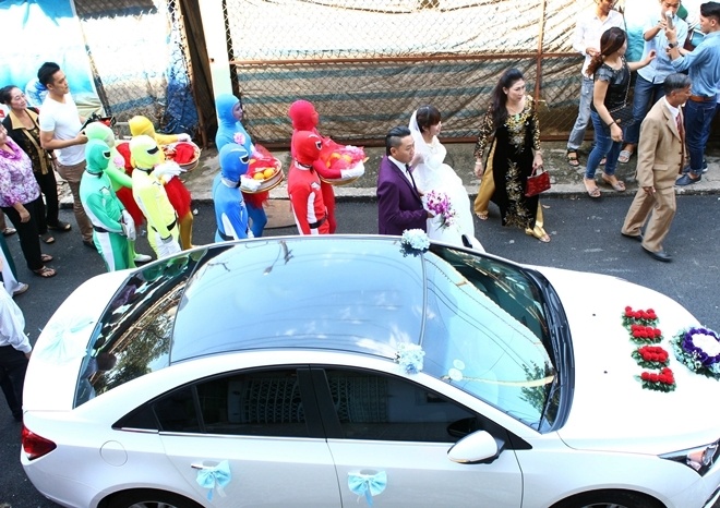 | Đội hình rước dâu đều là các thành viên hoạt động chung trong vũ đoàn Sài Gòn của cô dâu, chú rể. Cặp đôi quen yêu được 10 năm trước khi tổ chức đám cưới. |