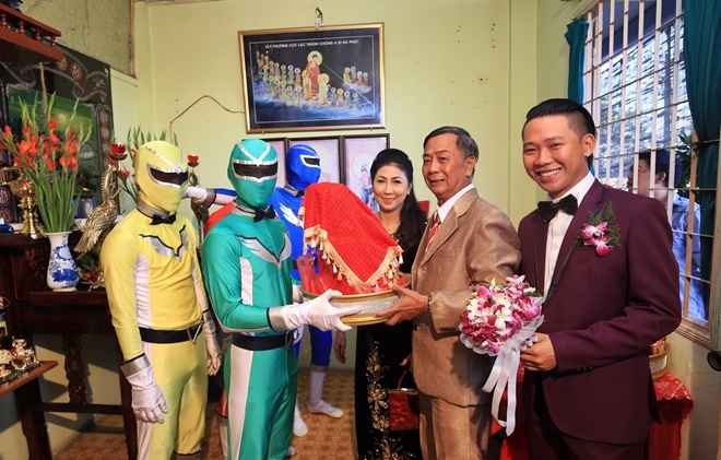 Diện những bộ trang phục siêu nhân trong loạt phim gắn liền với tuổi thơ của mọi người, dàn bê tráp gây náo loạn đường phố Sài Gòn khi đưa dâu bằng xe máy.