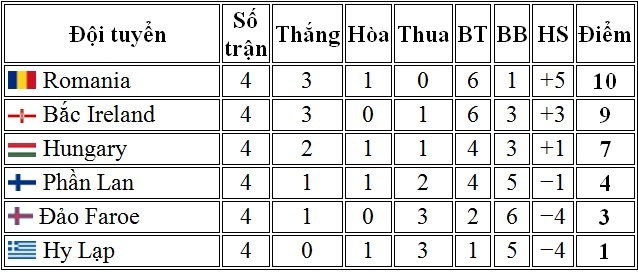 Thua 3, hòa 1 sau 4 lượt trận, Hy Lạp đang đứng dưới đáy bảng xếp hạng với 1 điểm. Kết quả này khiến tương lai của HLV Ranieri bị đe dọa nghiêm trọng chỉ sau 4 tháng tiếp quản ghế nóng từ người tiền nhiệm Fernando Santos.