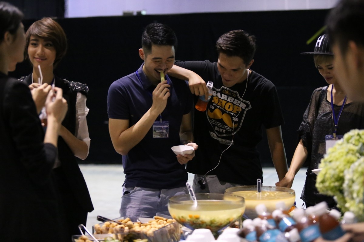 Dàn chân dài tranh thủ ăn vội khi tập show Đỗ Mạnh Cường
