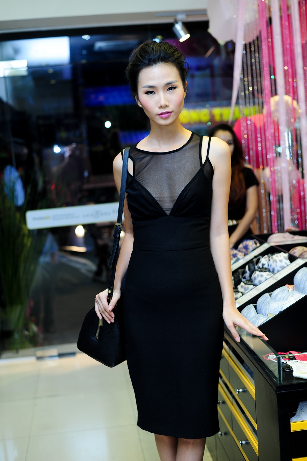 | Cô có dịp hội ngộ đàn chị Quanh Đi tại sự kiện này. Hai người mẫu cũng tư vấn cho nhau cách chọn một phụ kiện lót phù hợp. Quanh Đi thích những áo ngực có dây trong suốt để tiện mặc được nhiều bộ cánh từ đi tiệc đến chụp ảnh. |
