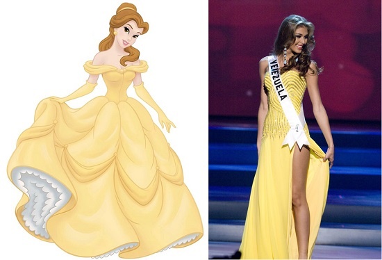 Hoa hậu Hoàn Vũ 2008 Dayana Mendoza không khác bản sao nàng Belle trong Người đẹp và Quái vật. Người đẹp trông giống Belle từng mái tóc, biểu cảm cho đến chiếc váy vàng rực rỡ. |