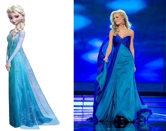 Hoa hậu Mỹ 2009 với làn da trắng, mái tóc vàng óng và chiếc váy màu lam trông giống như Elsa – Nữ hoàng băng giá. |