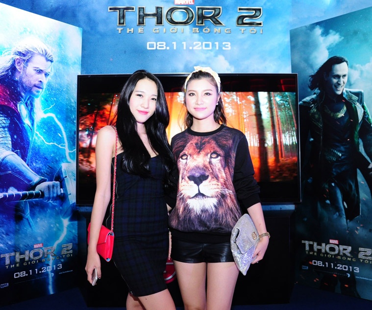 Diệp Lâm Anh, Thu Hiền, Hari đã có nhiều kiểu tạo dáng dễ thương tại buổi ra mắt phim "Thor 2" tối qua tại TP.HCM.