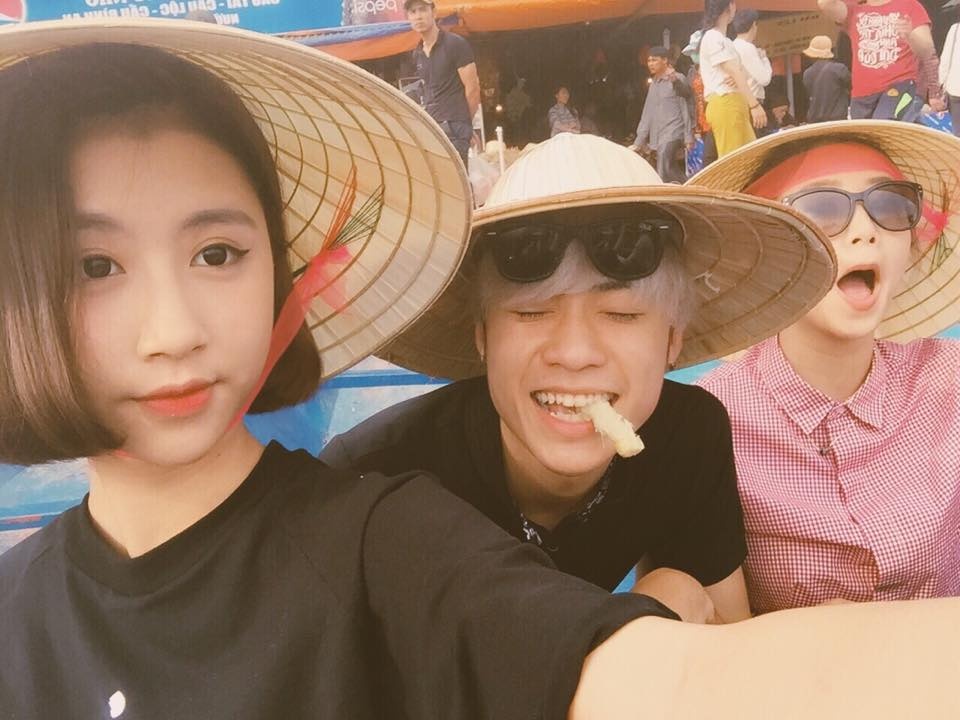 Hot boy Bê Trần cũng không thể vắng mặt. Mỗi thành viên đều trang bị cho mình một chiếc nón lá che nắng.