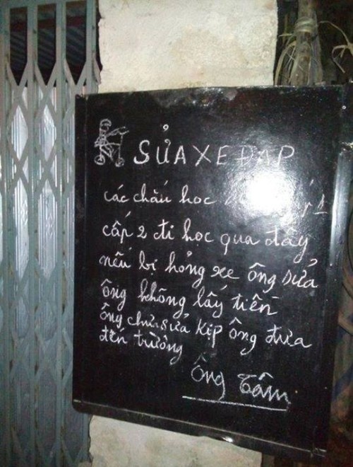 Trên tấm bảng đen đặt trước cửa nhà, ông viết: "Sửa xe đạp - Các cháu học sinh cấp 1, 2 đi học qua đây nếu bị hỏng xe ông sửa ông không lấy tiền, (nếu) ông chưa sửa kịp (thì) ông đưa đến trường - Ông Tâm".