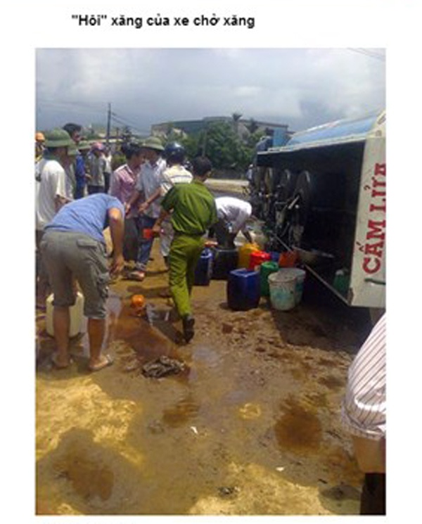 | Vô tư "hôi của" xe chở xăng bị lật. |