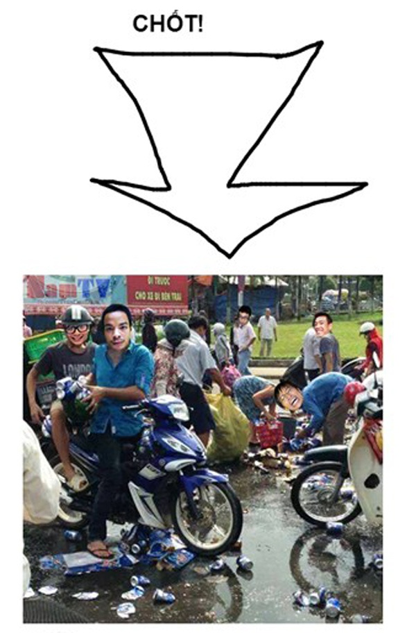 | Nội dung chính của những tấm ảnh chế lên án hành động "hôi của" xấu xí của một bộ phận người có mặt tại hiện trường lúc xe bia bị lật. |