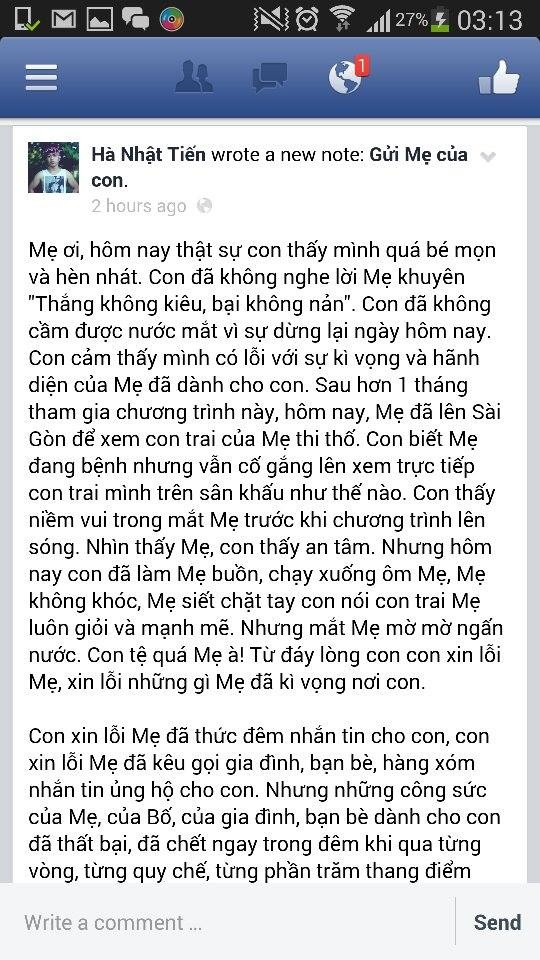 Con xin lỗi mẹ đã thức đêm nhắn tin cho con, con xin lỗi mẹ đã kêu gọi gia đình, bạn bè, hàng xóm nhắn tin ủng hộ cho con. Nhưng những công sức của mẹ, của bố, của gia đình, bạn bè dành cho con đã thất bại, đã chết ngay trong đêm khi qua từng vòng, từng quy chế, từng phần trăm thang điểm đều bị di dịch. mẹ đừng buồn và thất vọng vì con mẹ nhé!