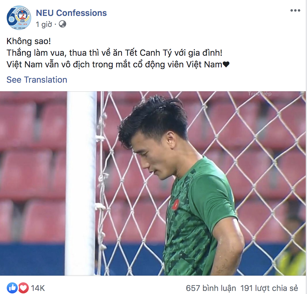 | "Thắng làm vua, thua về ăn Tết" là câu cổ vũ của dân mạng dành cho các cầu thủ U23 Việt Nam. Ảnh: Nghiền bóng đá, NEU Confessions. |
