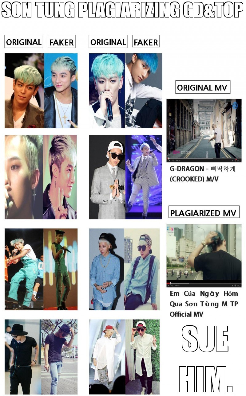 | Sơn Tùng M-TP bị tố đạo phong cách của 2 thành viên Big Bang - G-Dragon và TOP trên trang Allkpop kèm theo lời kêu gọi "Sue him" (Hãy kiện anh ta). |
