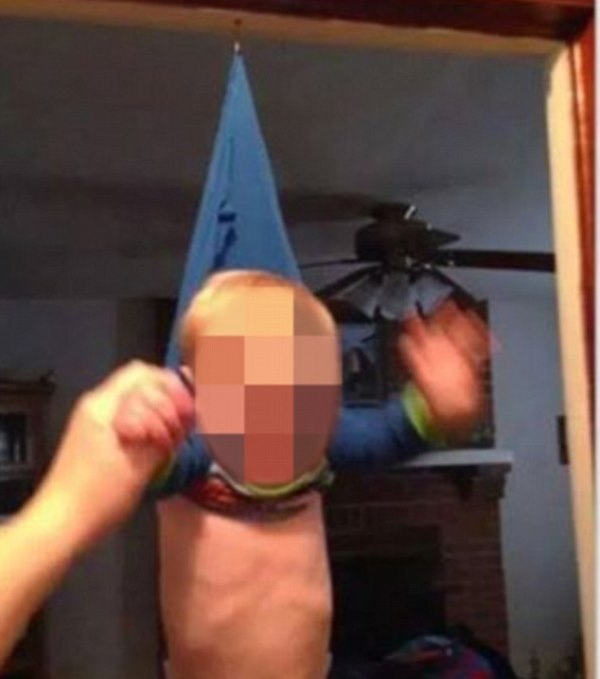 | Bức ảnh bé trai 14 tháng tuổi bị treo lên khung cửa gây bão cộng đồng mạng. |