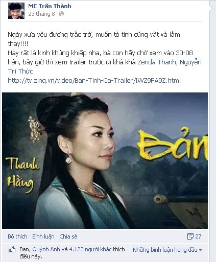Khi đoạn trailer Bản tình ca được Trấn Thành và Thanh Hằng đồng loạt chia sẻ trên trang cá nhân, lần đầu tiên người hâm mộ tìm được sợi dây liên kết giữa hai nhân vật tưởng như… chẳng hề liên quan. Tuy nhiên, tới thời điểm này, vẫn chưa ai biết Bản tình ca là sản phẩm gì.