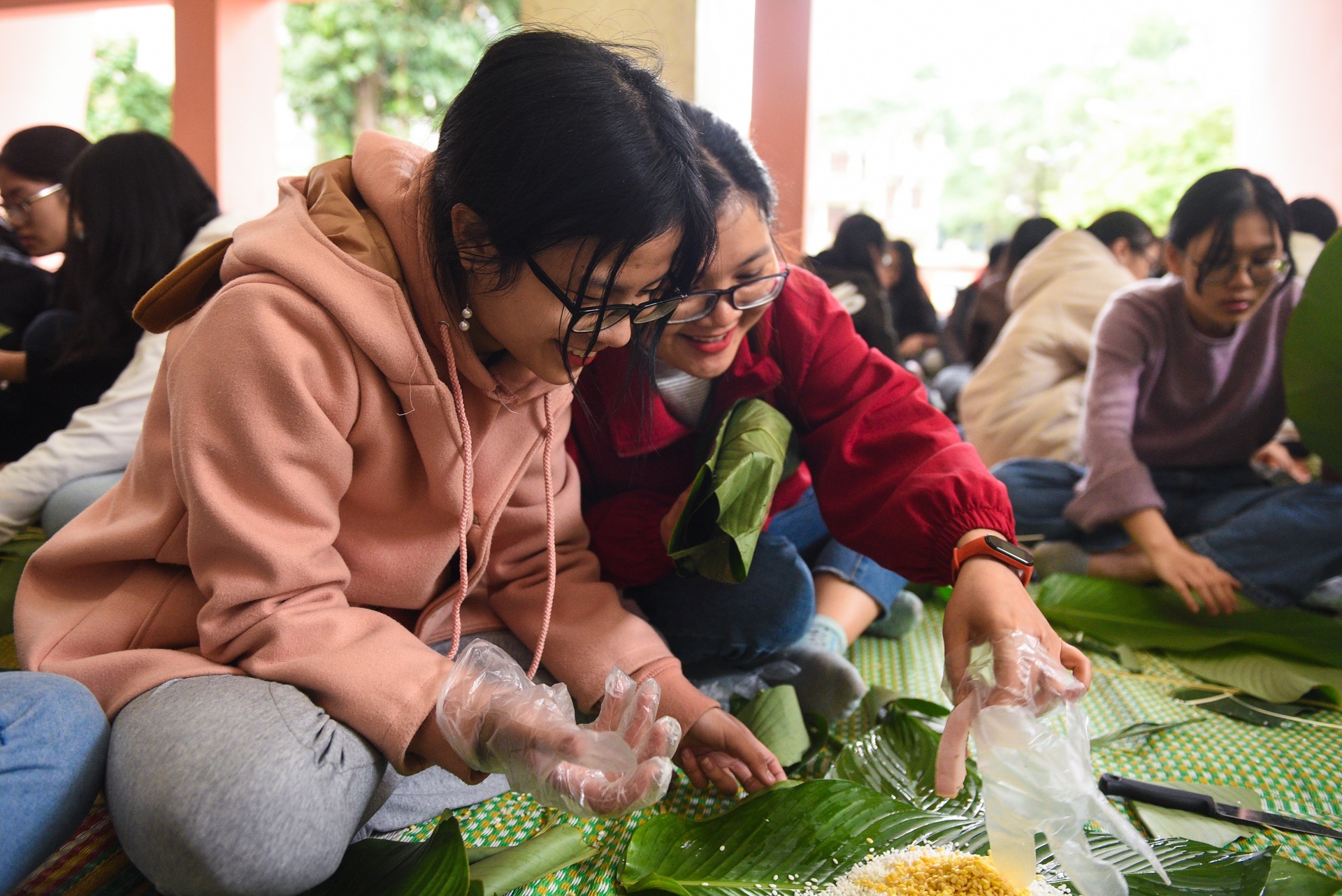 | Bạn Tuấn Anh (19 tuổi, Hà Nội) kể: "Những gia đình ở phố không có chỗ rộng để gói, nấu bánh chưng vào dịp Tết. Chúng mình không biết cảm giác gói bánh, nấu bánh chưng thế nào. Nhiều năm nay, gia đình mình cùng một vài người hàng xóm cứ 27 Tết lại quây quần gói bánh chưng để làm sống lại không khí ngày Tết". Ảnh: Nguyễn Oanh. |