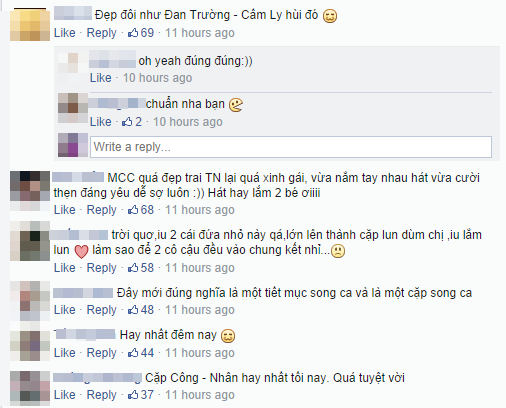 | Khán giả chế ảnh bày tỏ sự thích thú và yêu mến dành cho hai thí sinh của đội Cẩm Ly. |