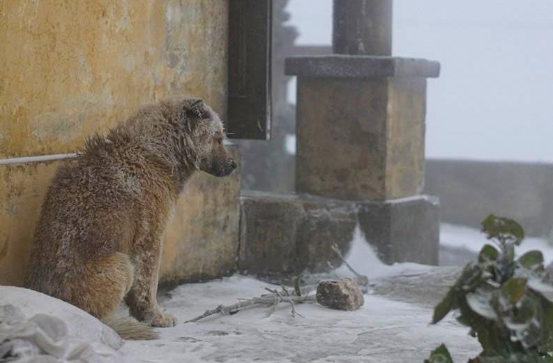 | Chú chó ngồi co ro trong tuyết tại núi Mẫu Sơn, Lạng Sơn. Ảnh: Tùng DQ. |