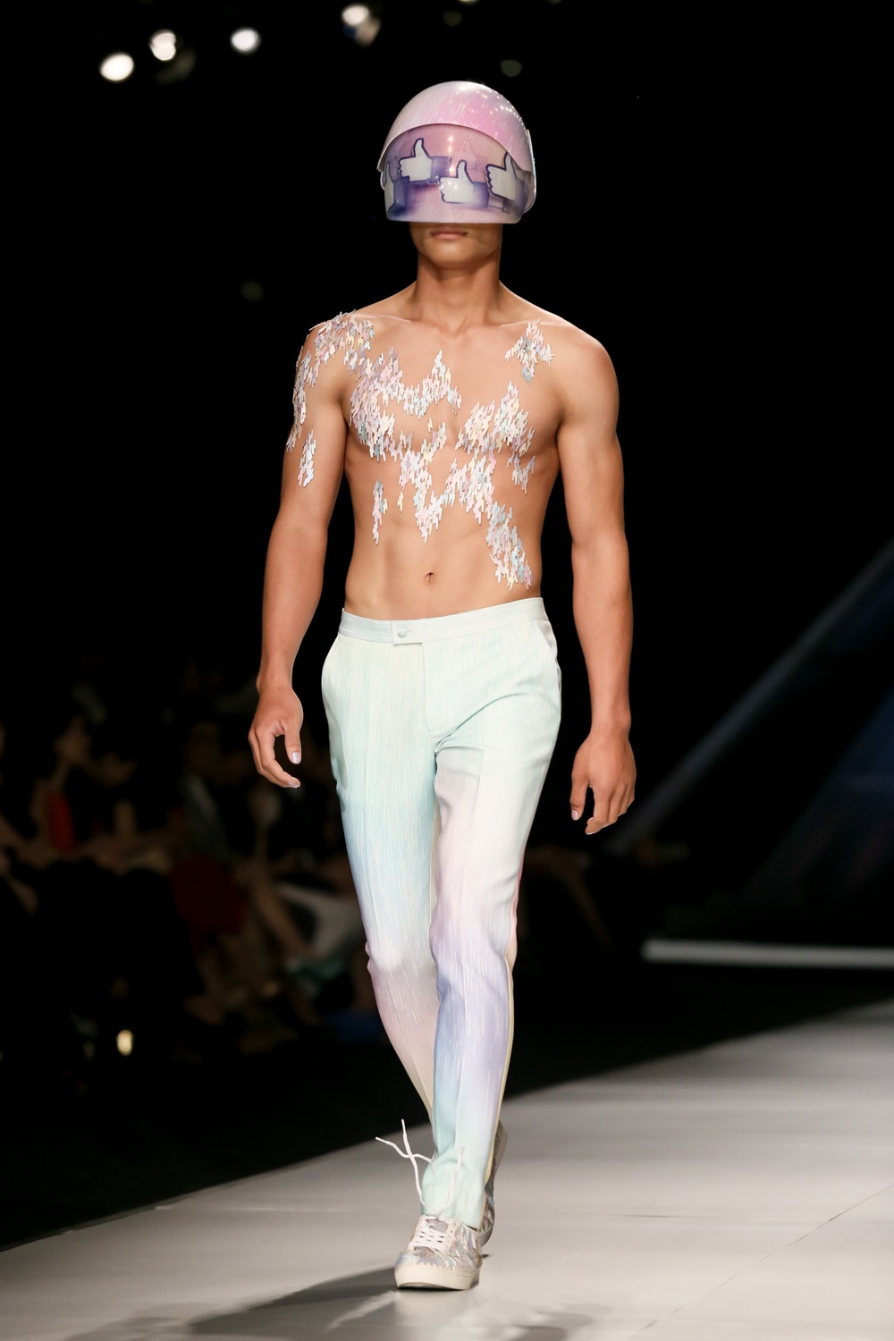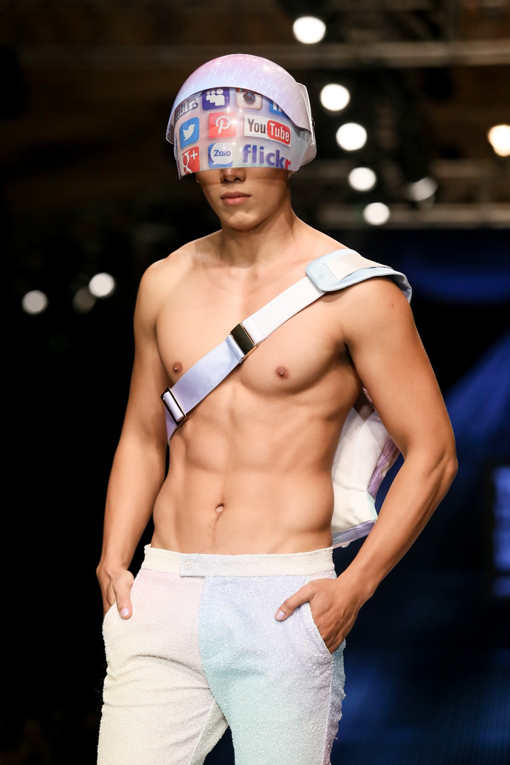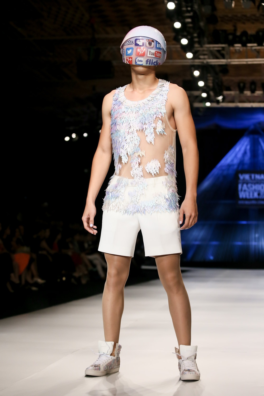 Người mẫu nam ấn tượng trên sàn diễn với mốt trong suốt và mũ bảo hiểm cá tính.