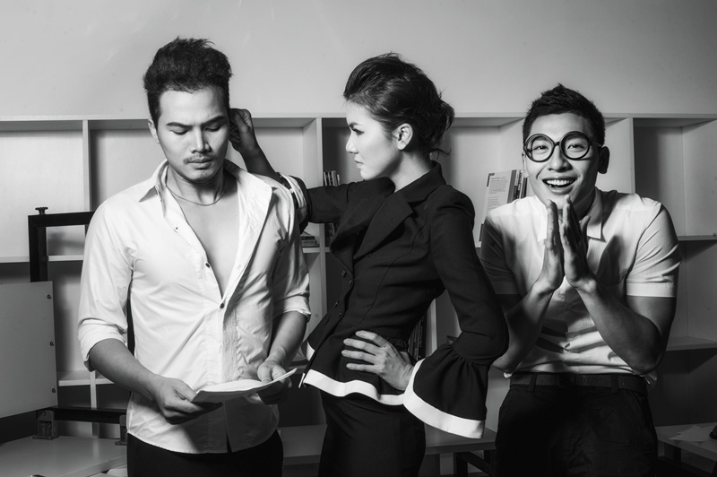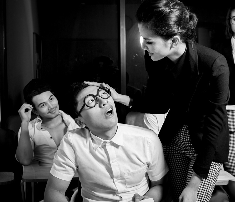 | Tạ Thúc Bình và Trần Trung vào vai hai nam học trò tinh nghịch và luôn bị ''cô giáo'' Hà Thu trách mắng. |