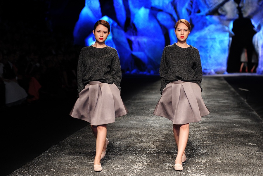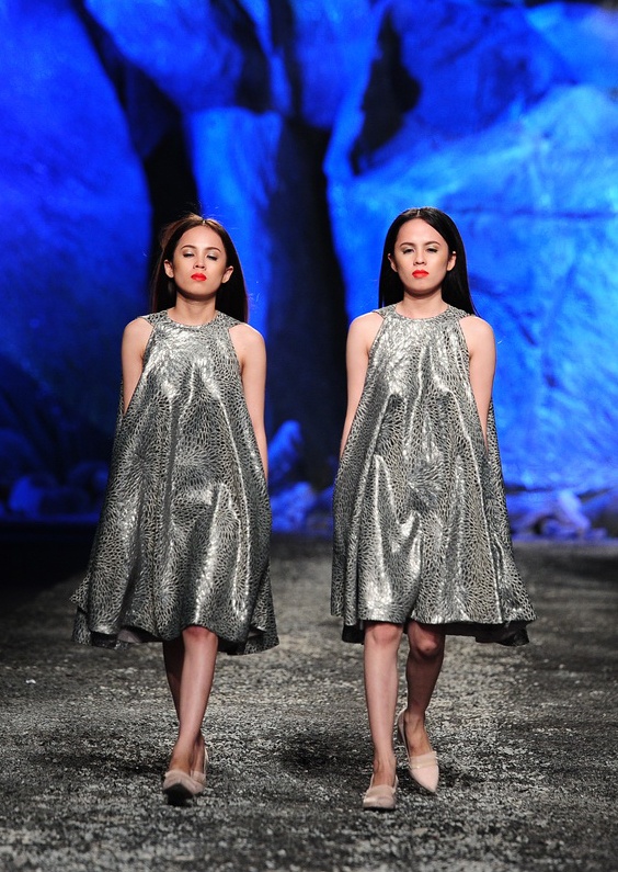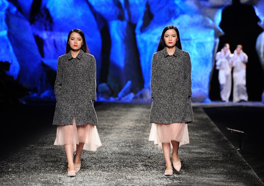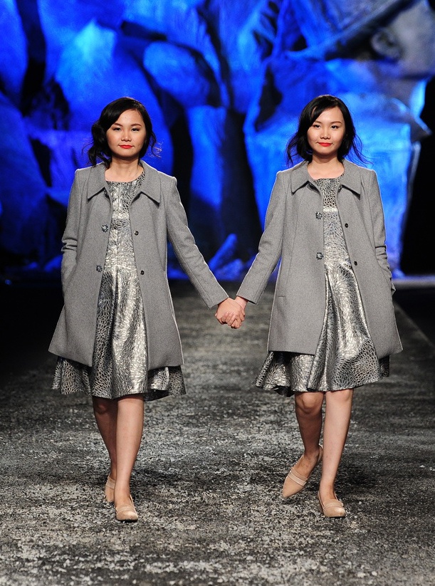| Trên sàn diễn có ý tưởng con đường đầy đá, các người mẫu sinh đôi thể hiện tự tin và nổi bật không kém cạnh dàn chân dài chuyên nghiệp. |