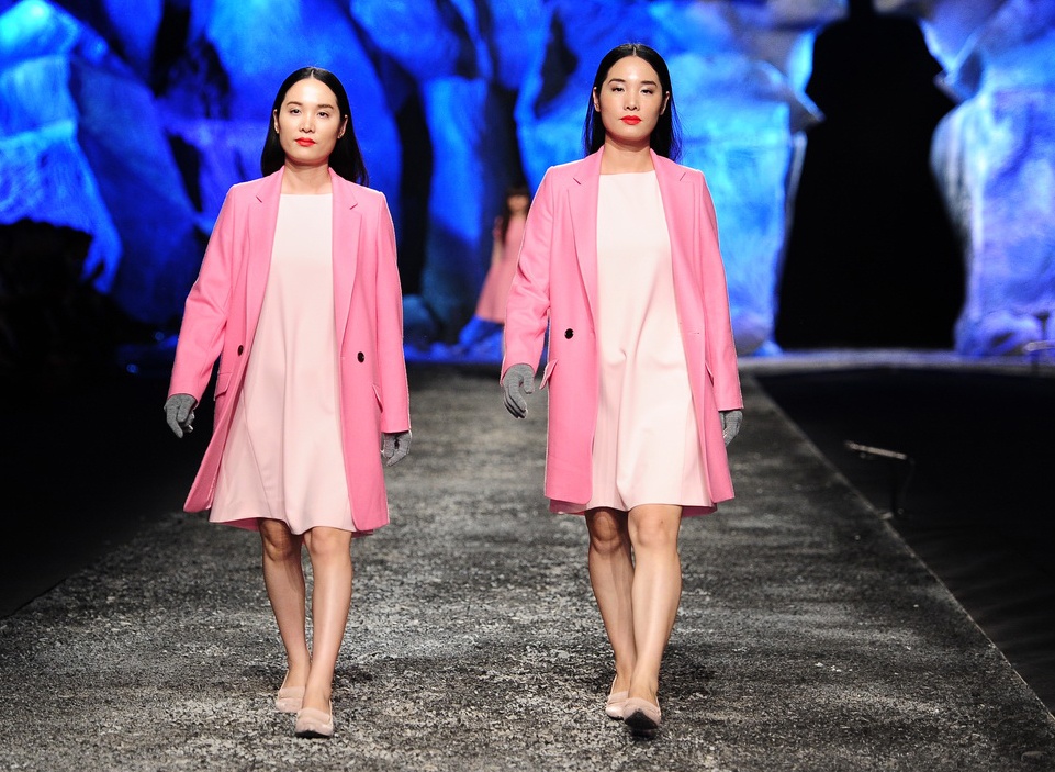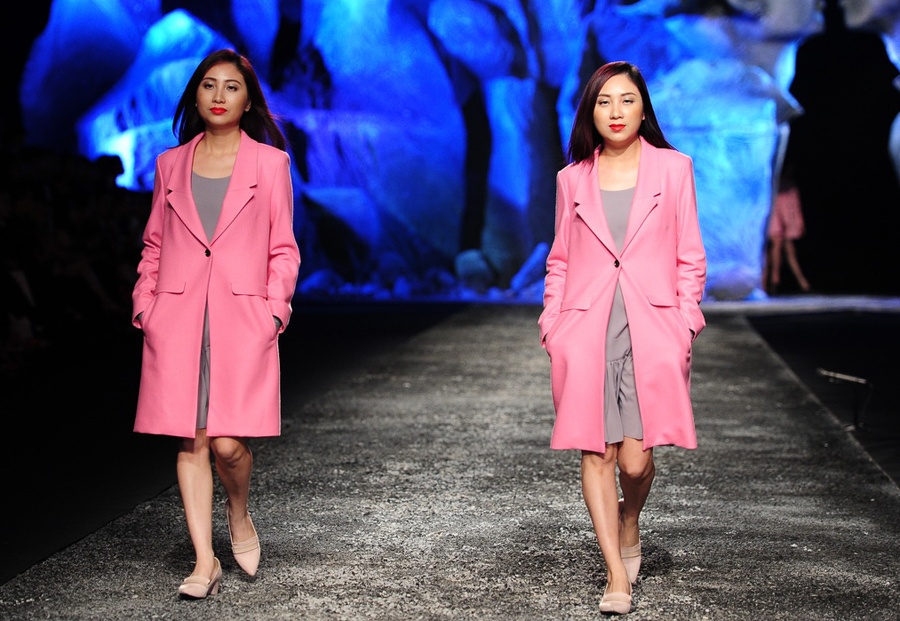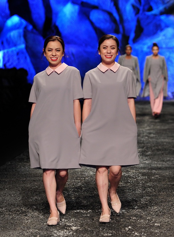 | Đồng hành cùng các người mẫu chuyên nghiệp, cặp sinh đôi tuổi đôi mươi thể hiện trang phục tông màu xám, hồng. |