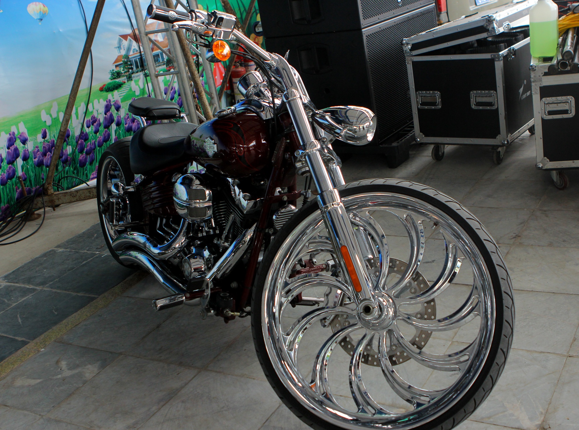 | Chiếc Harley-Davidson Rocker C độ nổi bật với cặp vành cỡ lớn. Theo chủ xe, vành trước được xem to nhất trang bị cho một chiếc mô tô ở Việt Nam trong khi bánh sau với lốp to ngang. |