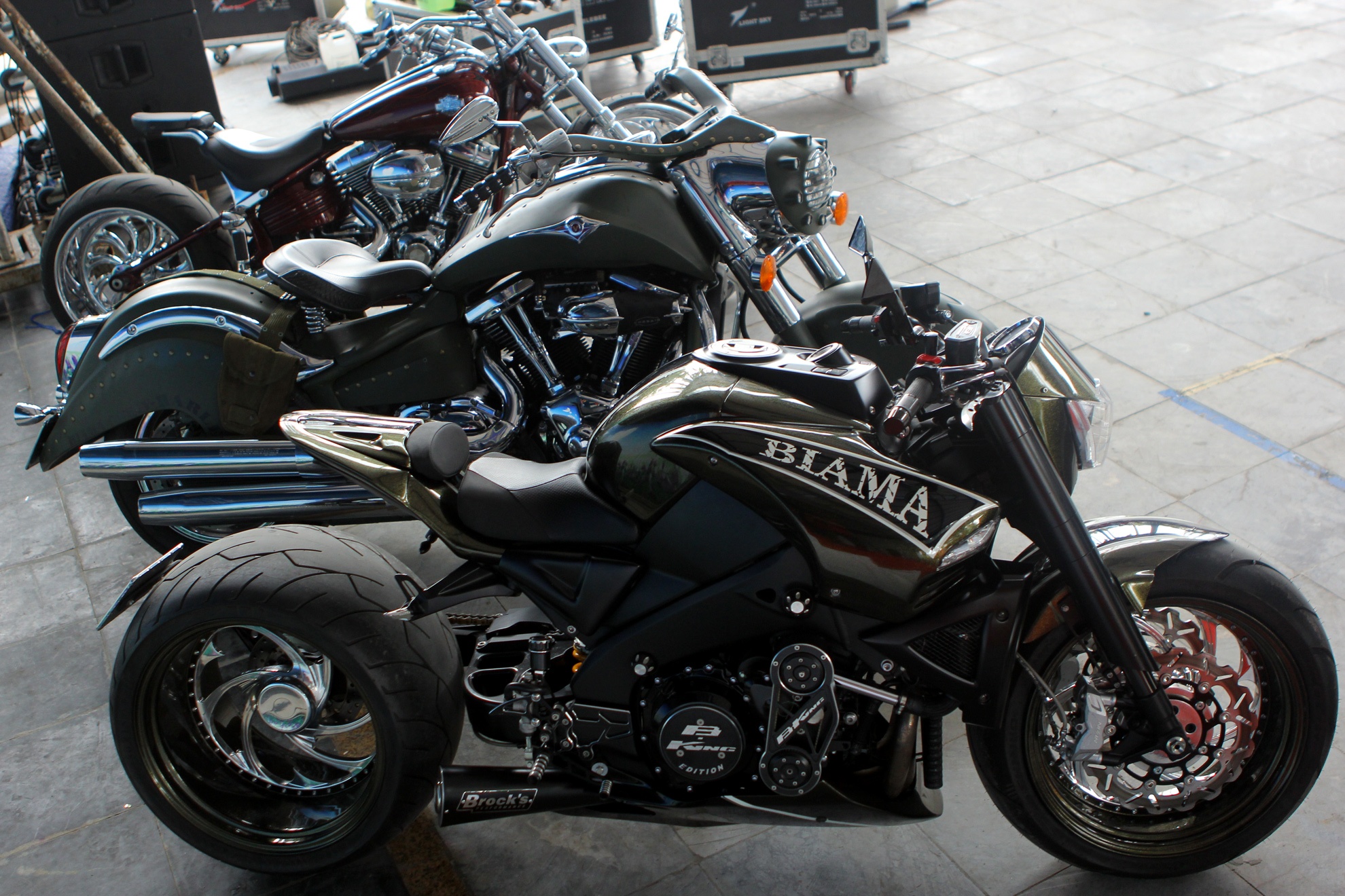 | Chính giữa sân khấu chương trình trưng bày bộ ba mô tô độ độc đáo của một thành viên Harley Chapter Việt Nam. |