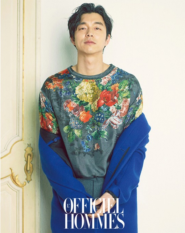 | Nam diễn viên Gong Yoo ứng dụng họa tiết hoa theo phong cách tranh sơn dầu với áo thun dài tay kết hợp áo choàng dáng dài màu xanh cobalt ấn tượng. |