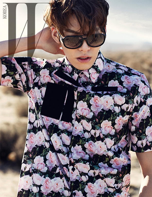| “Trai hư” Kim Woo Bin gợi nhớ đến những chuyến đi mùa hè đầy nắng gió bằng áo sơ mi họa tiết hoa hồng nhạt trên nền xanh đen. |