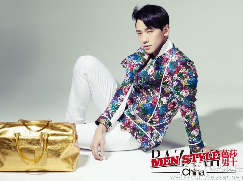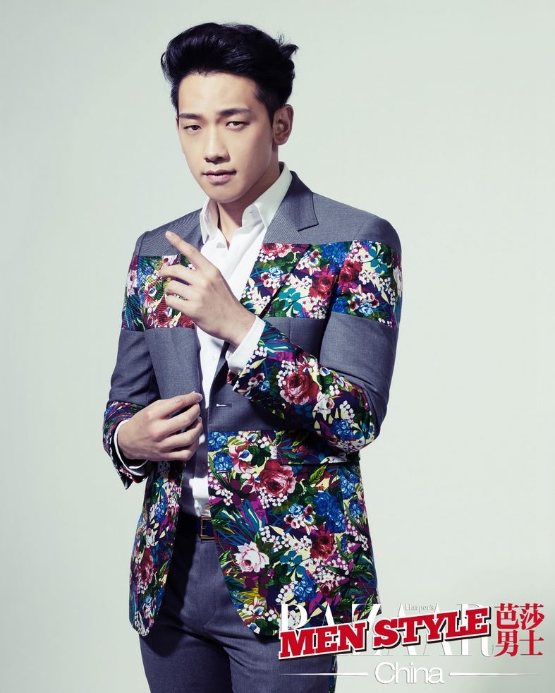 | Trên ấn phẩm Harper Bazaar Trung Quốc, Bi Rain trẻ trung nhờ họa tiết hoa nhiệt đới. Với bộ đồ xám, họa tiết nổi bật này giúp xua đi sự nhàm chán và trịnh trọng vốn có của suit. |