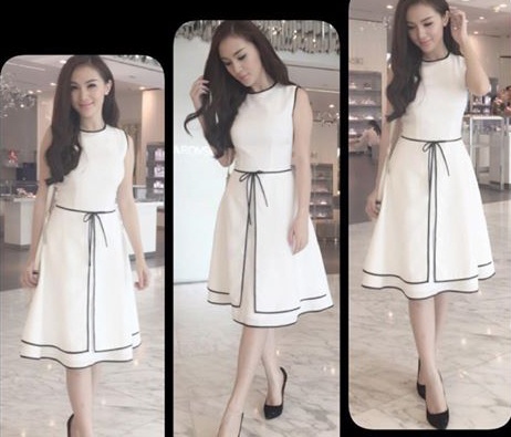 | Tại TP.HCM, Kelly Nguyễn xuống phố nền nã với trang phục màu trắng, diềm đen nổi bật. |