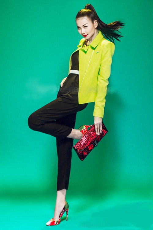 | Chân dài cá tính Thanh Hằng chọn áo khoác xanh lá mạ mix kèm phụ kiện tông đỏ. |