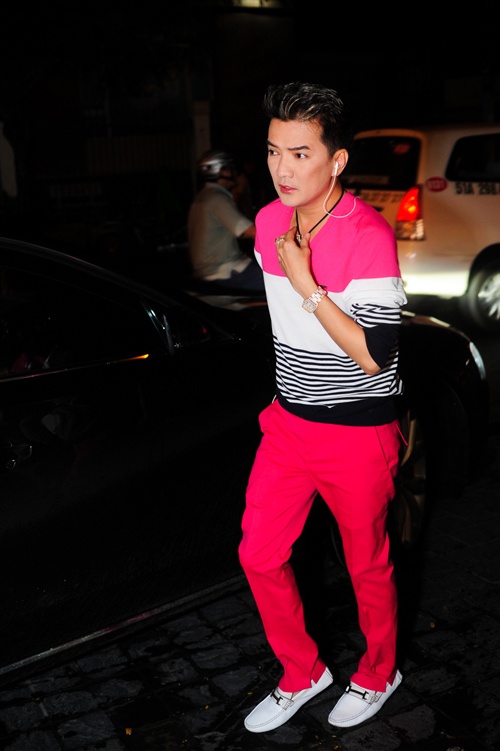Ngay sau khi đến với trang phục giản dị, Mr.Đàm thay bộ vest lịch lãm để mặc lên sân khấu. |