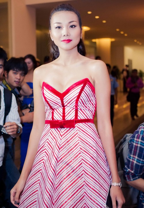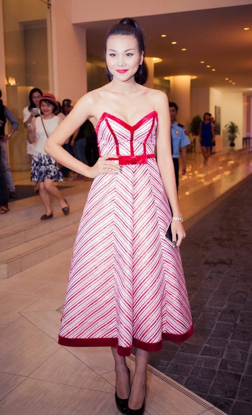 Thanh Hằng trẻ trung nhưng không kém phần quyến rũ trong chiếc váy nữ tính, khoe vai trần. |
