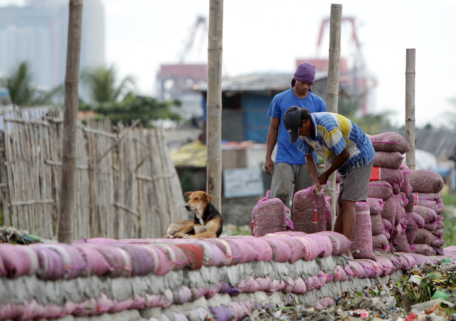 | Người dân tại một làng ven biển xếp kè từ những bao cát để chống bão Haiyan. Ảnh: EPA. |