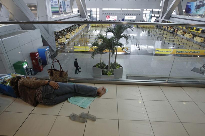 | Hành khách ngủ trong sân bay quốc tế Ninoy Aquino ở Pasay, Manila vào sáng 8/11. Hơn 200 chuyến bay trong phi trường này phải hoãn vì bão Haiyan. Ảnh: Reuters. |