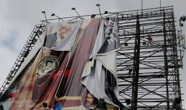 | Công nhân dỡ bỏ tấm áp phích lớn tại Makati, Philippines. Tổng thống Philippines Benigno Aquino cảnh báo người dân rằng bão Haiyan cực kỳ nguy hiểm. Ông khuyến cáo dân nên chuẩn bị trước khi bão tới để giảm thiểu thiệt hại do bão gây ra. Ảnh: AP. |