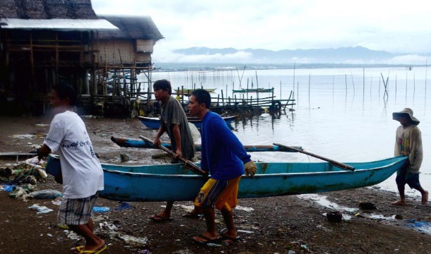 | Ngư dân kéo thuyền bè lên bờ ở vùng Ormoc. Chính phủ cấm mọi phà hoạt động và yêu cầu ngư dân không ra khơi tại những vùng chịu ảnh hưởng của bão. Ảnh: EPA. |