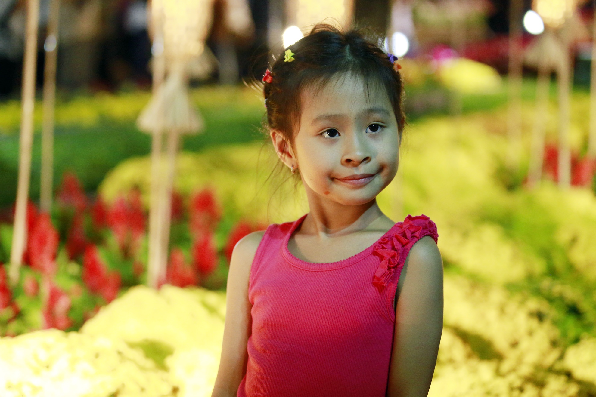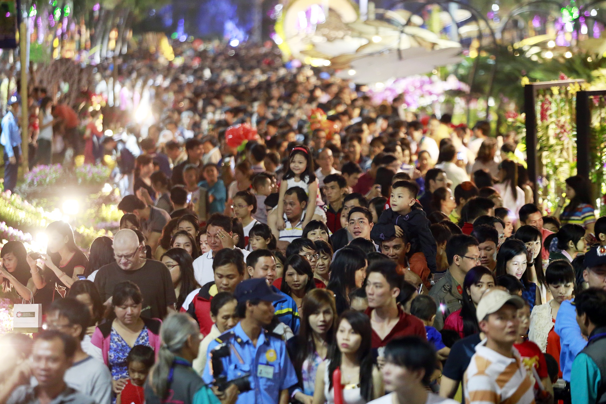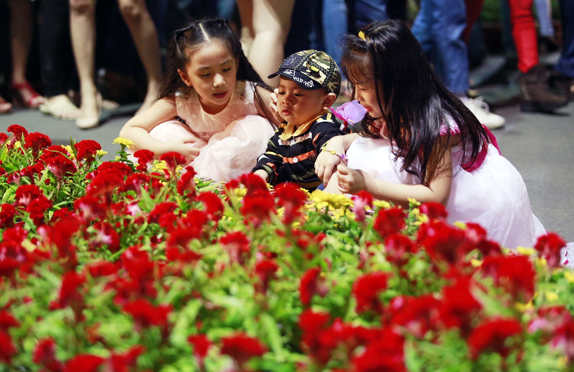 | Mặc kệ dòng người chen lấn, 3 bé này vẫn có chỗ để ngồi và... nghịch hoa. |