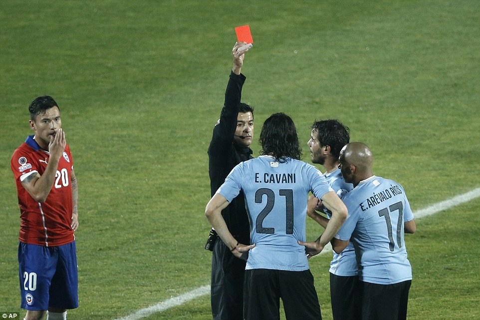 | Tấm thẻ đỏ của Cavani ở phút 63 là bước ngoặt của trận đấu. Chân sút thuộc biên chế PSG nhận thẻ vàng thứ 2 sau khi vỗ nhẹ vào má hậu vệ Jara của Chile. |